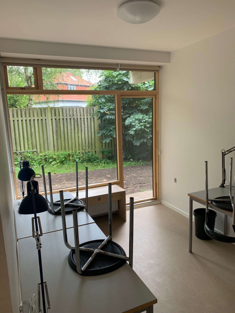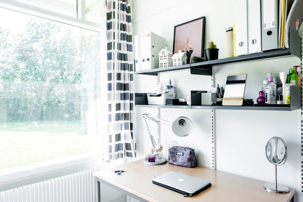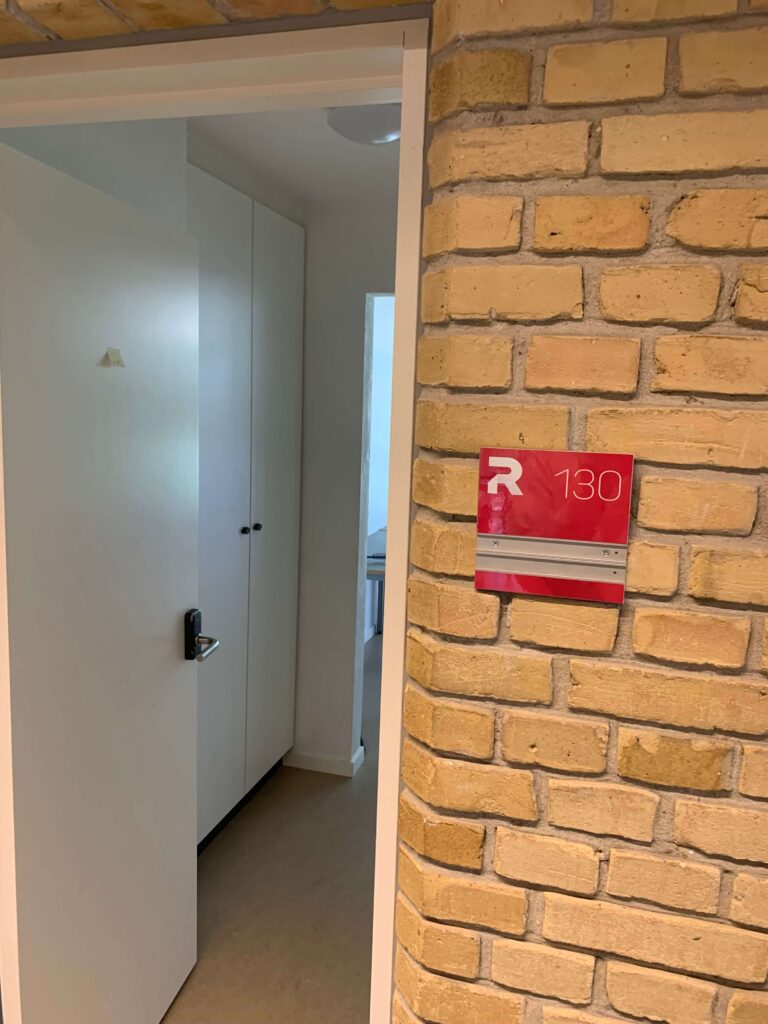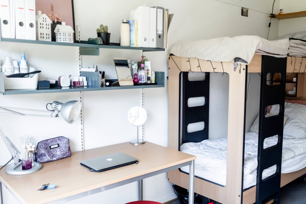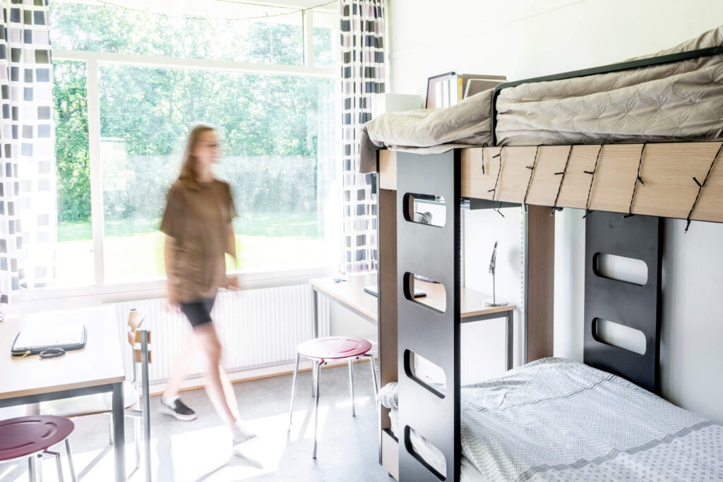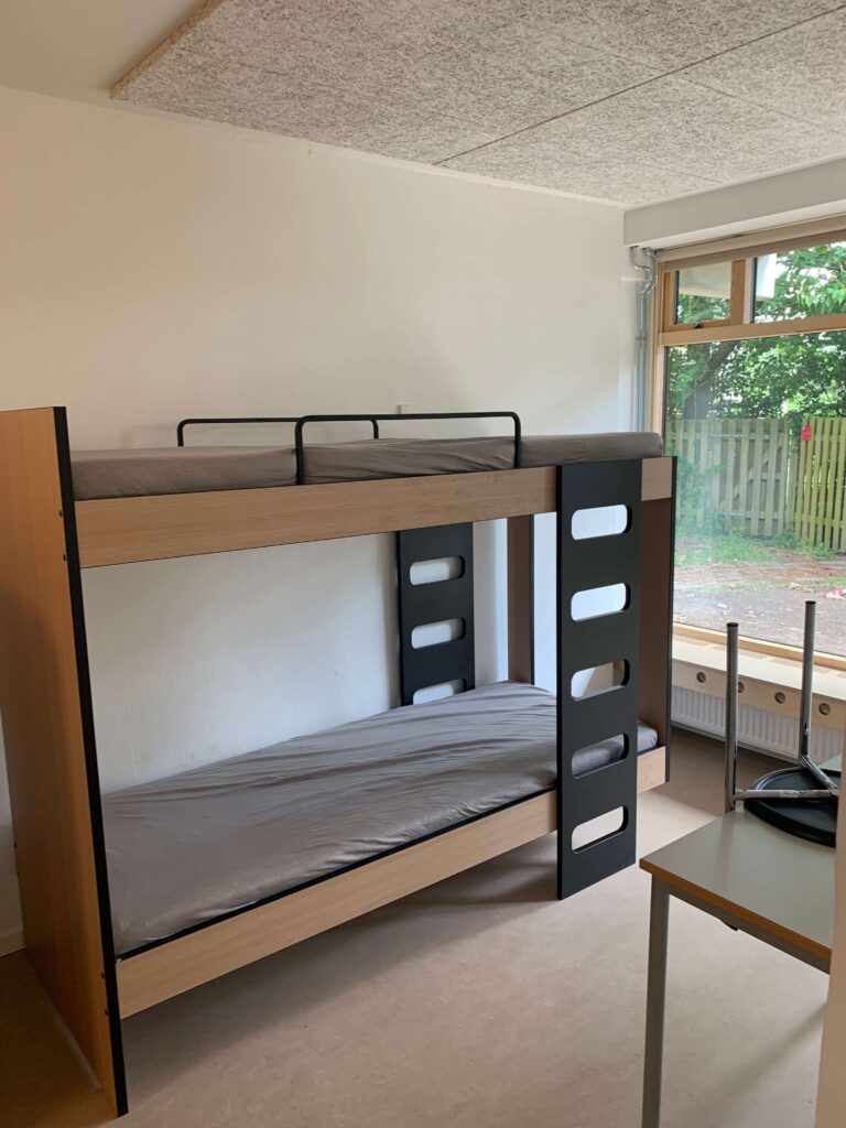 Begge vores kollegier, inkl. alle værelser og fællesarealer, blev renoveret fra tag til kælder i foråret 2021 og fremstår nu med nyt inventar – herunder gode senge (ekstra længde til basketspillerne), rummelige skabe, sengelampe, bogkasser og hylder, skrivebord, lænestol og lyse badeværelser. På værelserne er I fælles om at holde det rent og hyggeligt. Alle værelser har terrassedør ud til enten altan eller fliseområde/græsplæne. Ud over de 155 sengepladser på kollegierne, har vi et værelse med 4 sengepladser på 1. sal i hovedbygningen, som også er nyistandsat.